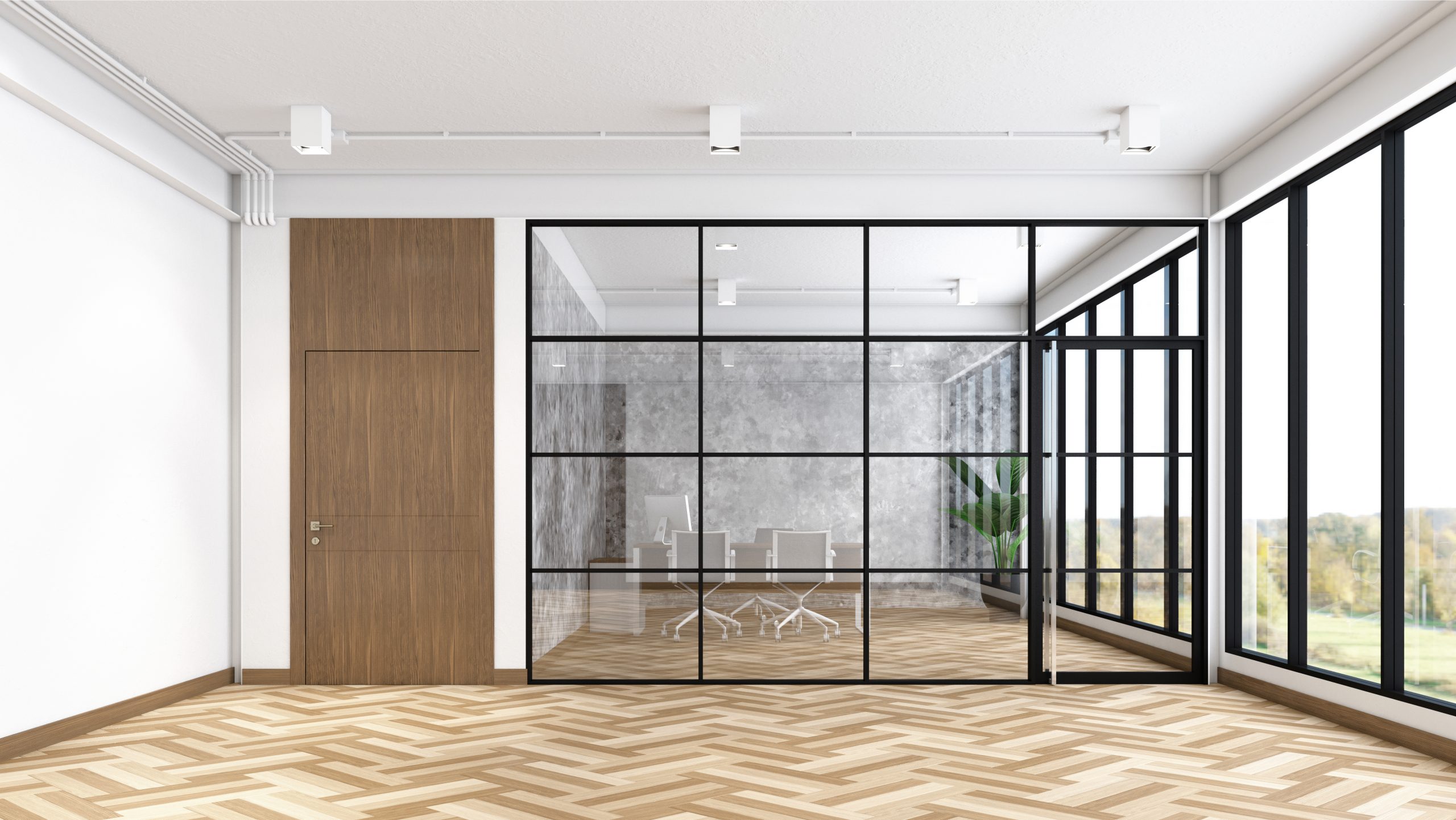 Die Trennwand aus Aluminium und Glas sorgt für ein offenes Flair und erhellt auch die dunkelsten Bereiche im Raum.